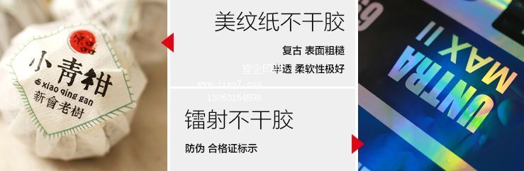 美纹纸不干胶 特点:表面粗糙,有纹路,纸面米白微透,有一种复古高雅的特性,是众多茶叶、食品、红酒、化妆品厂家定制标签的好选择。 优点:粘性很强的进口不干胶。 印制各种材质的不干胶标签(PET标签、PE标签、PVC标签、PP标签、合成纸标签、聚酯标签,透明膜标签、金银箔标签、卡纸标签等),专长服装吊牌、洗水标、织标、名片设计制作、平面设计制作等。 主要业务:不干胶标签印刷,不干胶商标贴纸、商场条形码打印标签、流水号条形码标签、自动贴标机标贴、服装布唛、吊牌、卷装单双面印刷吊牌、激光防伪标签、珠宝标签等,另承接各种产品宣传画册. 不干胶标签印刷,因为主要印刷产品是以商品标签、标牌为主,所以也叫商标印刷。不干胶印刷,采用的是专用的复合纸张。这种纸必须由纸品加工厂预制。一般是在承印物的背面涂上一层不干胶,粘附在容易剥离的防粘纸上。印刷后用刀线轧印,剥去空白多余部分,在防粘纸上留下形状的印刷品,使用时将成品揭下来,粘贴到商品或包装物上即可。承印物除纸张外,还有金属箔、薄膜。
