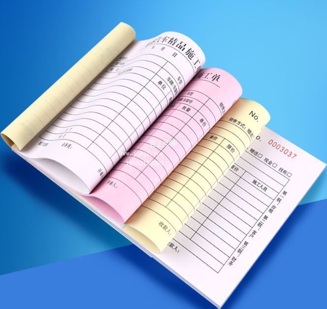 说明:无碳纸联单就是多联单据按一定格式印刷在具有自动复写功能的无碳纸上,当书写*张纸时,垫在下面的多联纸在压力下起显色反应成为自动复写。