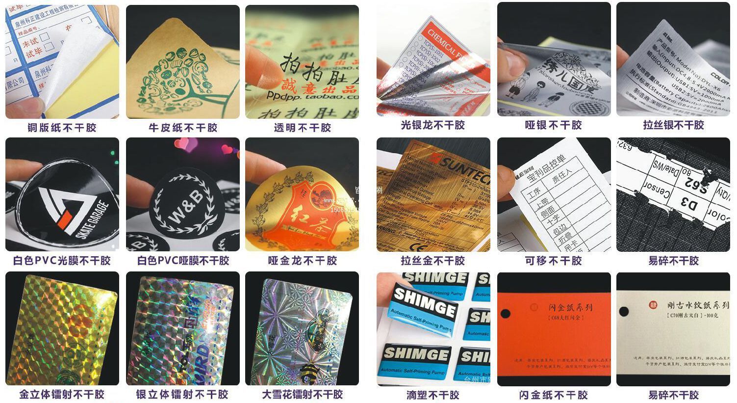 4、粘合剂 粘合剂是标签材料和粘合基材之间的媒介,起联结起到。按其特性可以分成永久性和纸张类不干胶的印刷工艺及加工方法--在谈不干胶标签的印刷工艺及其加工方法前,我们先要理解一下什么是不干胶标签的印刷,它与传统标签印刷比起有什么有所不同。不干胶标签也叫自粘标签,及时贴,即时贴,压敏纸等,是以纸张,薄膜或特种材料为面料,背面涂有粘合剂,以涂硅维护纸为底纸的一种复合材料,并经印刷,模切等加工后沦为成品标签。应用于时需从底纸上挤压,轻轻一按,即可贴到各种基材的表面,也可用于贴标机在生产线上自动贴标。