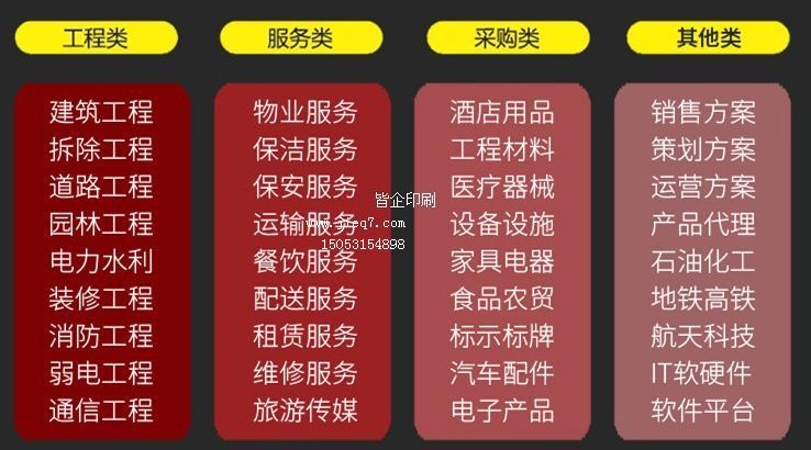 医疗器械类、实验设备类、学校实验室采购类、图书类、门窗采购类标书、办公设备类、家具类、监控系统采购及安装类、标志标牌的制作及安装类、服装采购类、汽车配件采购类标书等。