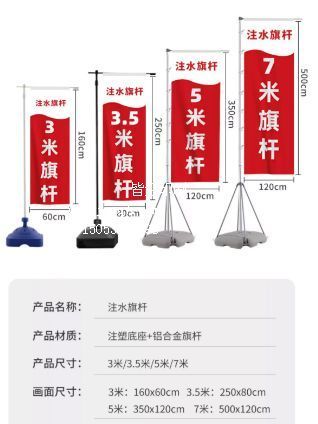 3、5米注水道旗画面尺寸:100*300、100*350、100*400、120*300、120*350、120*380cm等。